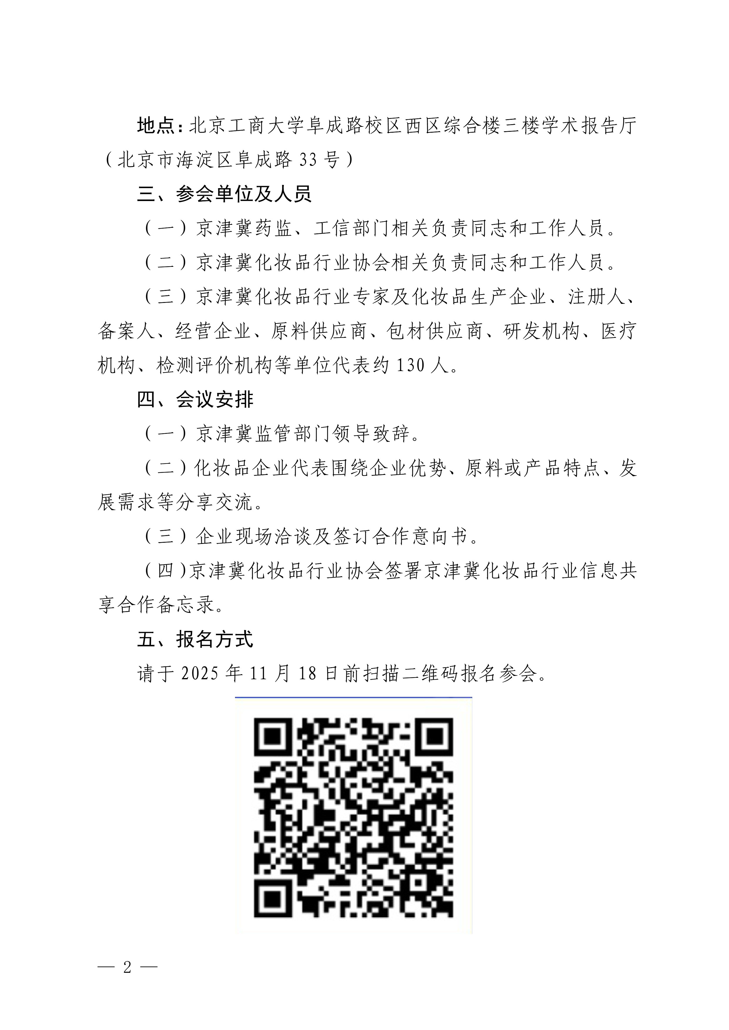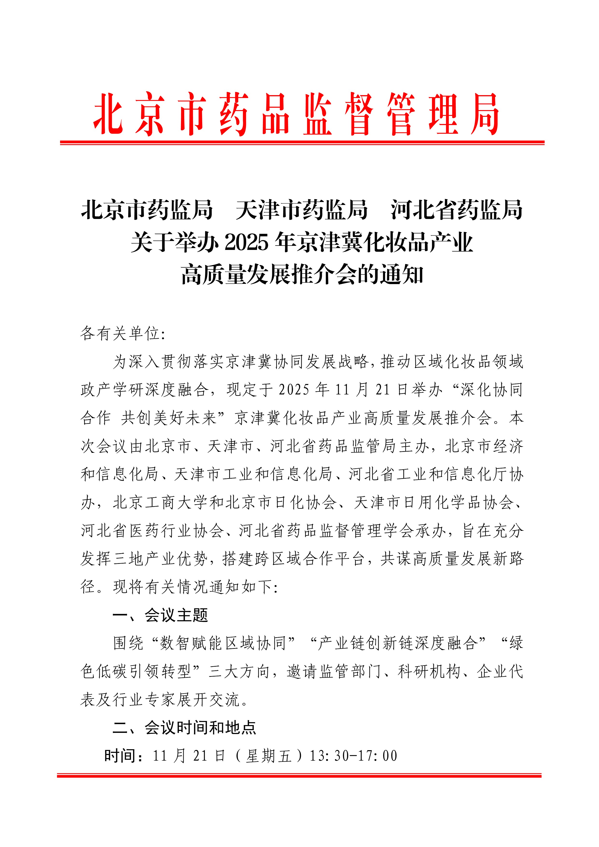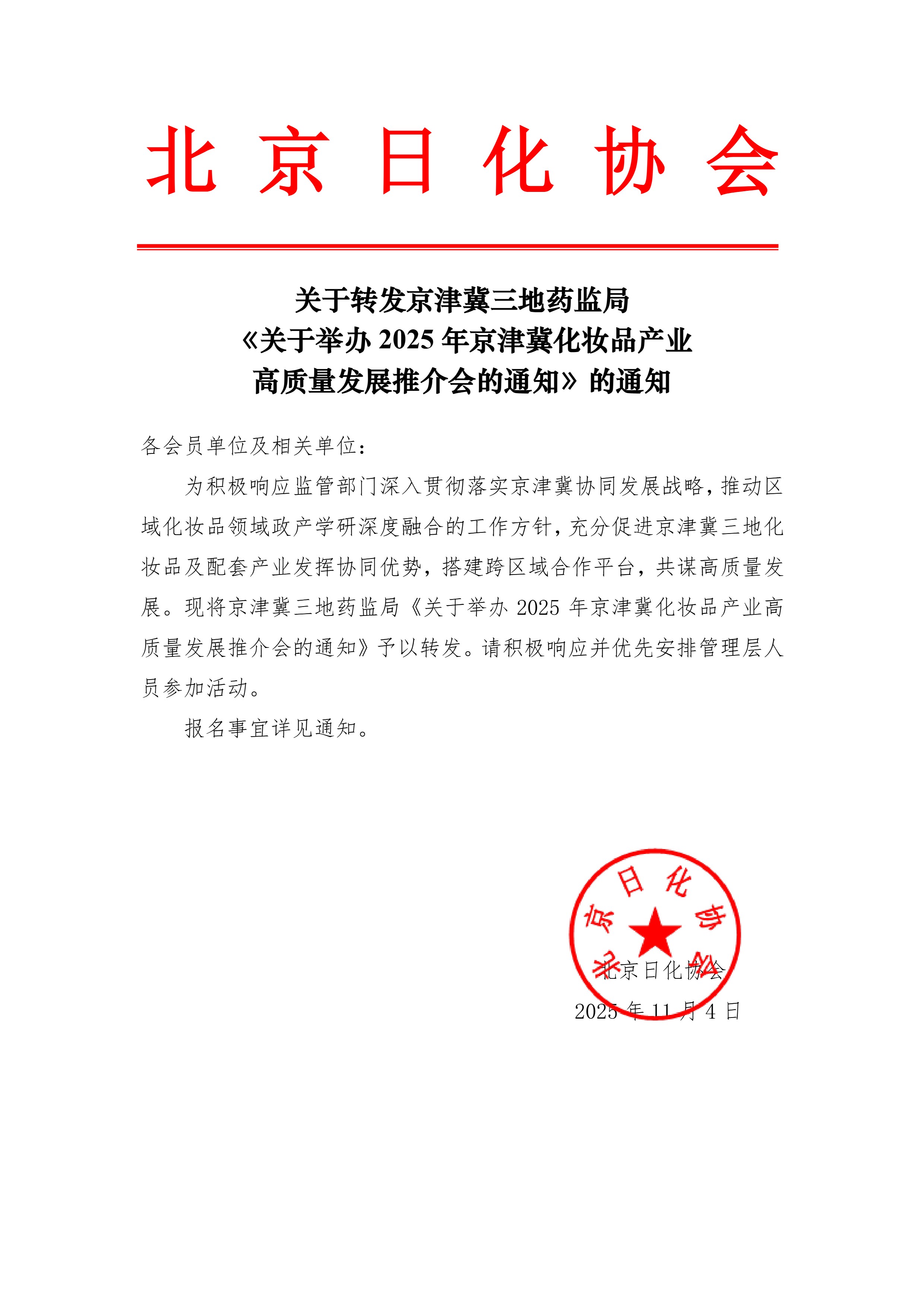 北京日化协会关于转发京津冀三地药监局《关于举办2025年京津冀化妆品产业高质量发展推介会的通知》的通知