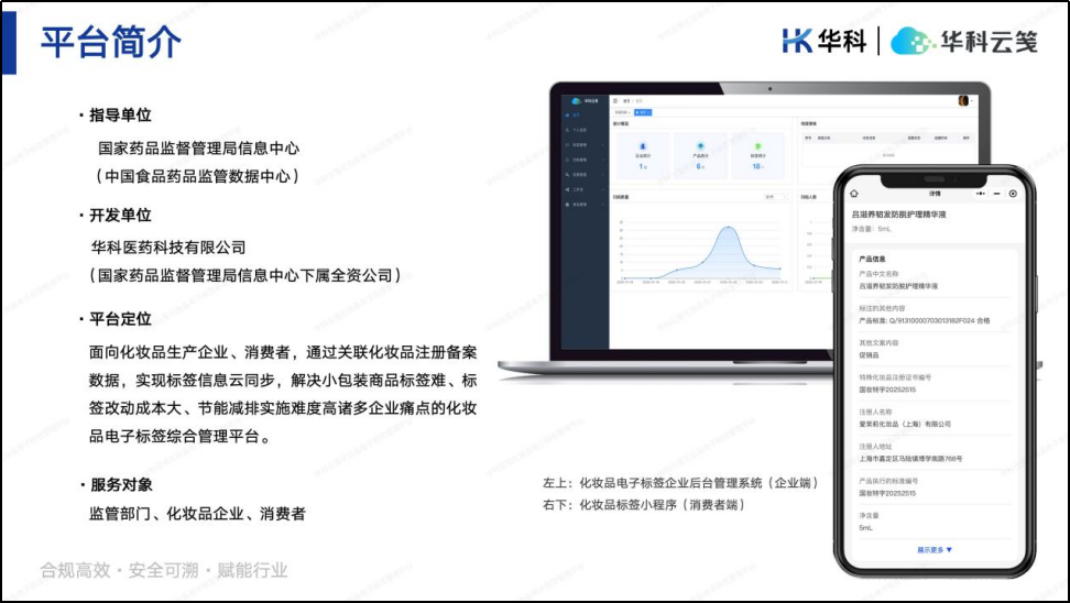 自2021年率先发起化妆品电子标签项目研究与探索,始终紧跟行业需求与监管导向,在国家药监局信息中心指导下,华科自主研发“华科云笺化妆品电子标签管理平台”以“合规高效、安全可溯、赋能行业”为核心原则,将监管要求、企业需求与消费者权益深度融合。通过关联化妆品注册备案数据,实现标签信息云同步,解决小包装商品标签难、标签改动成本大、节能减排实施难度高诸多企业痛点,为企业合规高效的提供电子标签全生命周期管理服务。